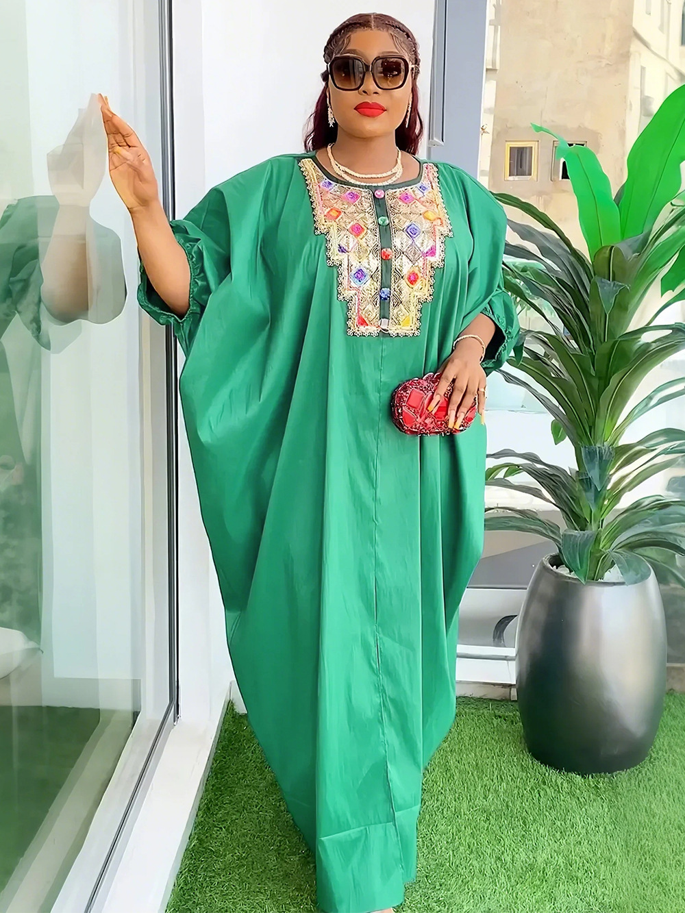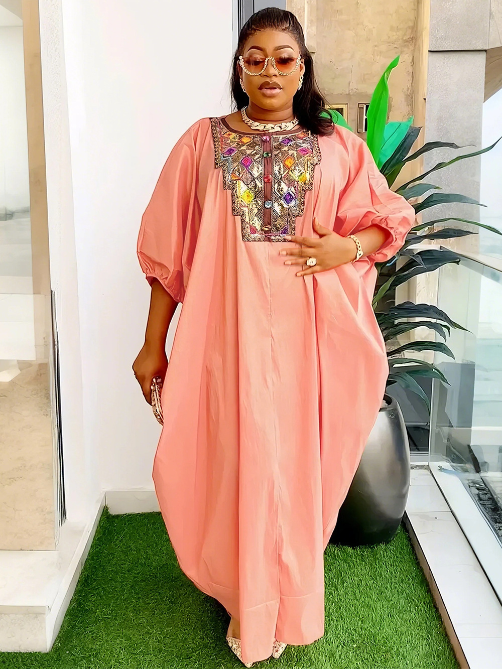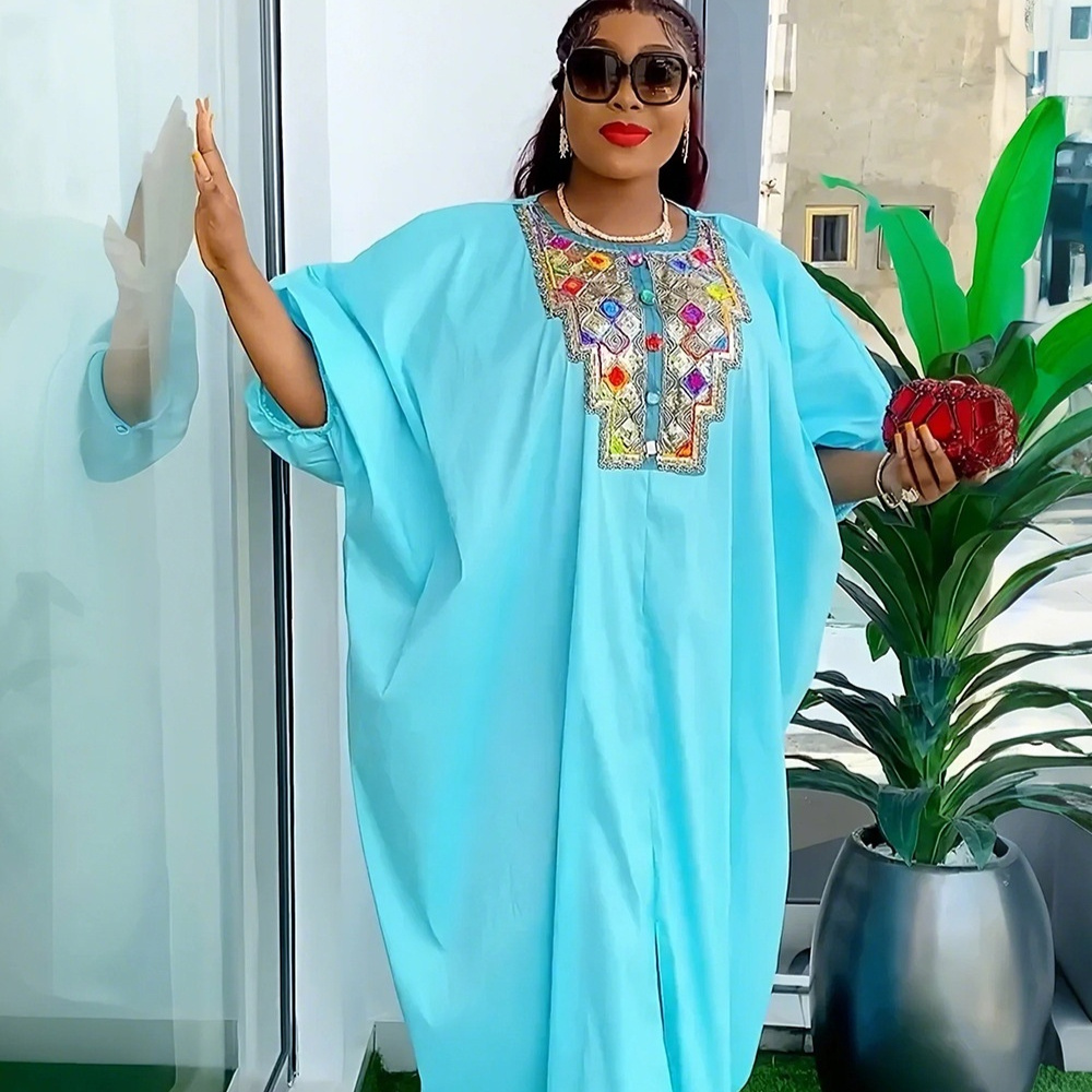 Robe africaine à paillettes, jupe longue évasée, manches lanterne — disponible en bleu clair, noir, orange, rouge et vert.